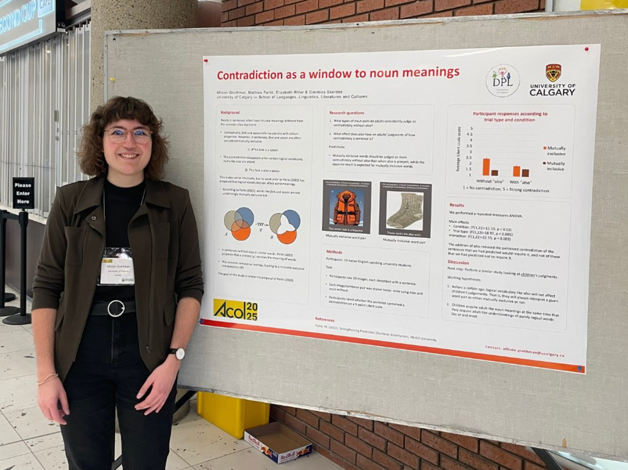 - Contradiction as a window to noun meanings. Grothman, A., Paillé, M., Ritter, E. & Skordos, D. Poster presented at the Alberta Conference on Linguistics (ACOL) at the University of Alberta. November 22, 2025.